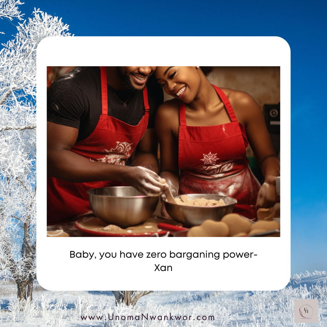“You have zero bargaining power.” I rubbed flour on the other eyelid and drew an X on her forehead. I leaned in, our faces were so close that we were inhaling each other’s breath. She stopped moving as the atmosphere shifted.