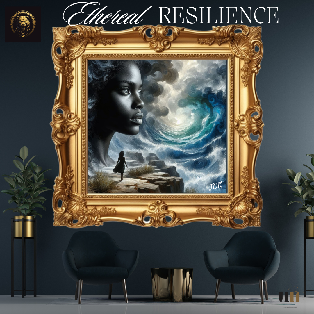 ...In a world where the sea and sky danced in tempestuous harmony, there stood a black middle-aged woman—a beacon of determination and resilience. Her gaze, unwavering, fixed upon the distant horizon, as if challenging the very elements that threatened her existence. The canvas came alive with dark blue and grey swirls, each stroke echoing the turbulence of the sea and the tumultuous sky. The waves crashed against the rugged cliff, their fury a stark contrast to the woman's serene presence. She was a silhouette against the chaos, her skin kissed by salt and wind.