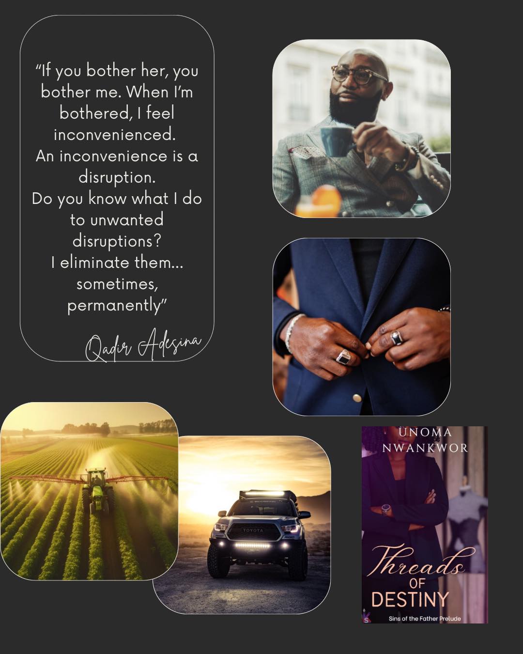 In Threads of Destiny, you get a sweet, sexy, swoonish adventure with Qadir Adesina of Ile Oloro Farms & Adesina Enterprises and Orefi Agada of Ziedu Fashions.